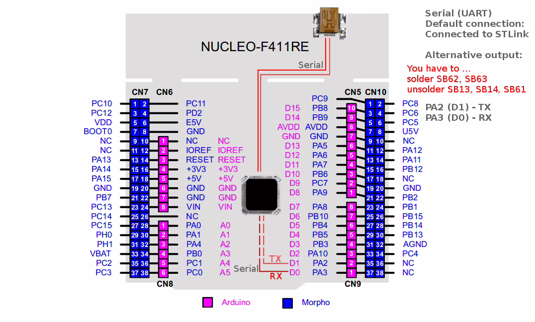 Pokud chcete mít připojenou sběrnici Serial na D1/TX a D0/RX, musíte pozměnit nastavení propojek na zadní straně Nucleo-64 desky. Zapájejte propojky s názve SB62 a SB63. Tím fyzicky propojíte USART sběrnici (Serial) s piny označenými jako D0 a D1.