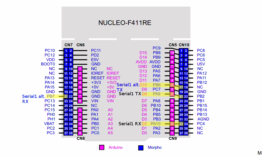 Příklad s využitím alternativního zapojení Serial1 (TX – PB6, RX – PB7, oba na Morpho konektorech).