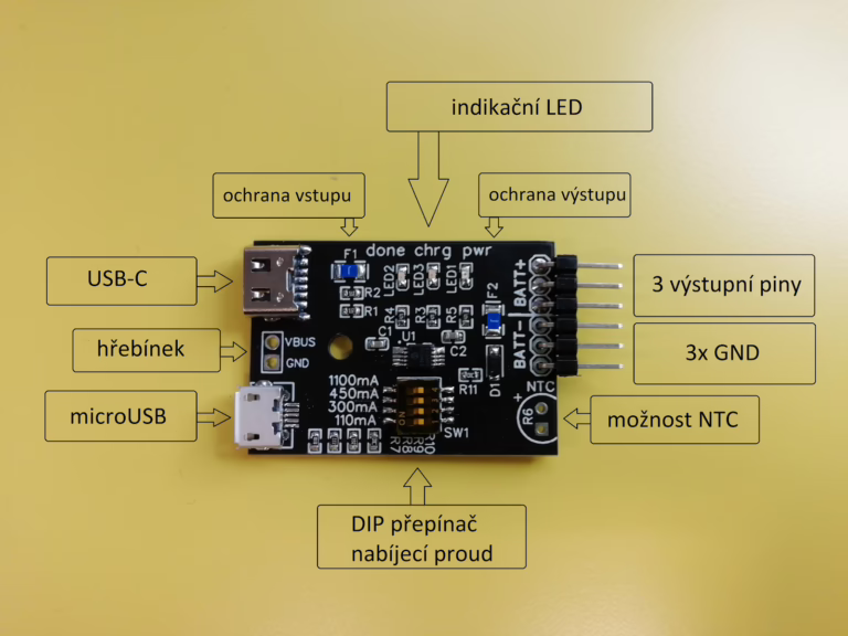 Modul napájený ze solárního panelu nebo USB-C s výstupem pro LiPol akumulátor a se stabilizovaným výstupním napětím pro zařízení.