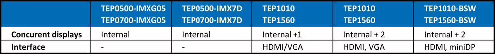 Modely série TEP0500/TEP0700 jsou optimalizovány na cenu. Nepoužívají rozšiřující modul, RS232, CAN a digitální vstupy/výstupy (DIO) nejsou galvanicky odděleny. Modely série TEP1010 a TEP1560 používají rozšiřující modul, k dispozici je i modul bez galvanicky oddělených rozhraní. Dostupná rozhraní specifikuje tabulka č.3