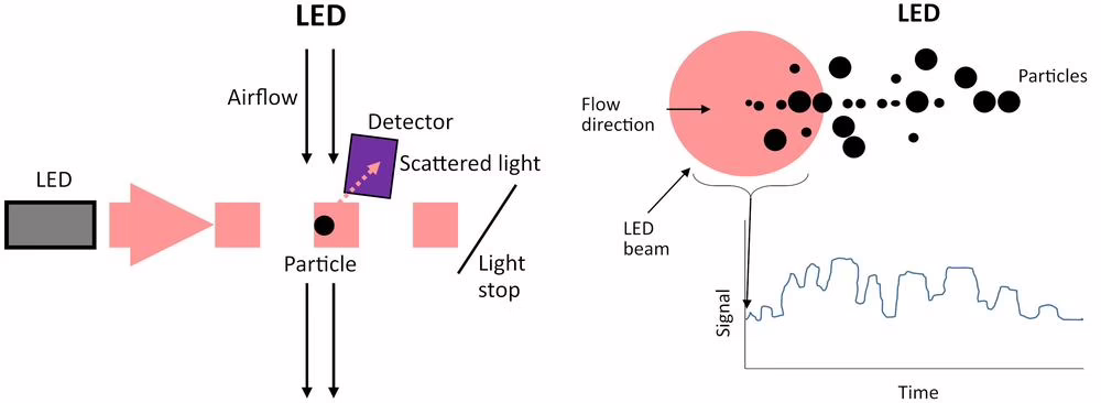 Senzory využívají vlastnosti světla rozptýleného na částici k měření počtu, velikosti a koncentraci částic. Základní komponenty jsou: zdroj světla namířený na částice, detektor měřící světlo rozptýlené částicí a elektronické obvody, které zpracovávají a analyzují výstup z detektoru.