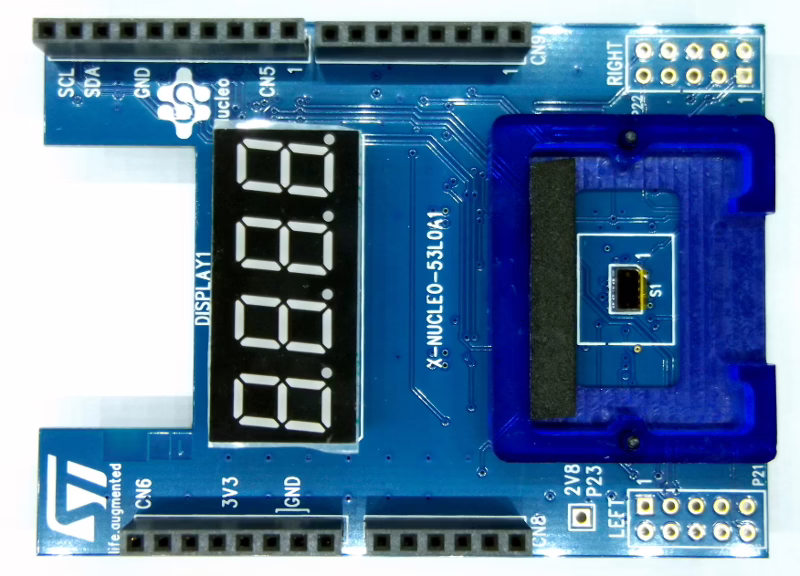 P-NUCLEO-53L0A1 obsahuje, kromě tří výše zmíněných obvodů, i 4 místný sedmisegmentový display (zobrazující vzdálenost) a krycí sklo.