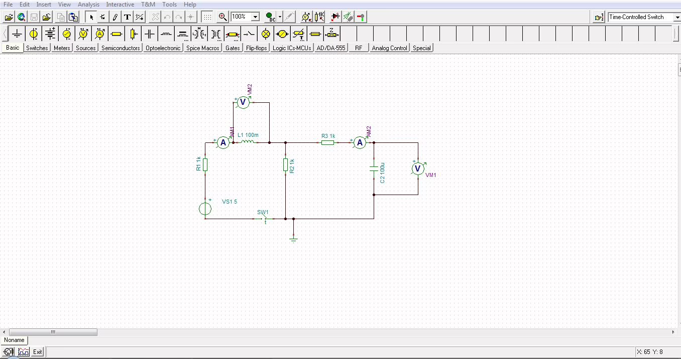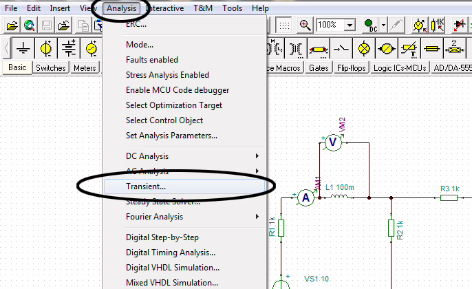 Už navrhnuté zapojení, kde budeme měřit přechodový děj na kondenzátoru a cívce.NEZAPOMEŇTE OBVOD UZEMNIT