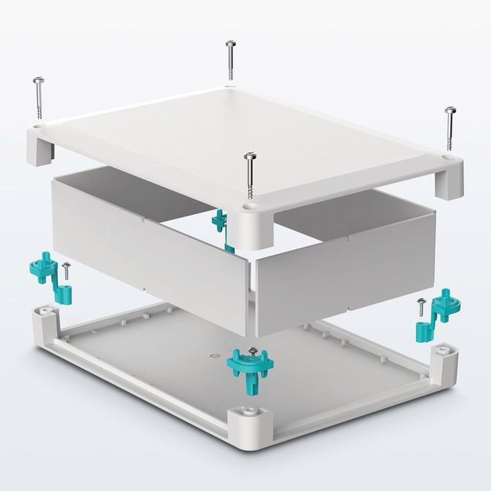 Krabička UCS sestává ze dvou identických polovin: vyjímatelných bočních panelů a barevně kontrastních rohových vložek. Pokud je potřebný vyšší prostor na téže ploše, pak systém UCS nabízí zajímavé řešení – boční panely a šrouby se dají vyměnit za verze, které jsou o 20mm vyšší nebo nabízí možnost doplnit výškový adaptér (změna z výšky 47mm na 67 mm). Tímto způsobem si snadno vytvoříte novou krabičku.