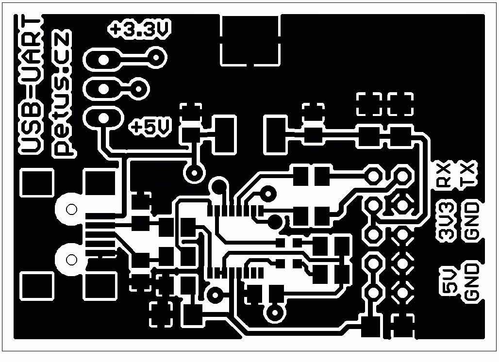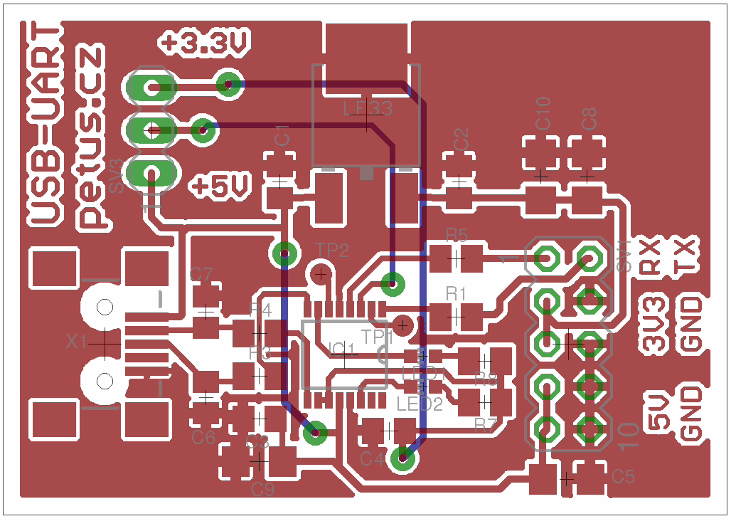 Článek obsahuje dvě PCB. Prvním z nich je pouze USB-UART převodník s vývody RX, TX, +3.3V z interního regulátoru (max 50mA, ale jsou z něj napájeny indikační LED), +5V z USB a celé je to zapojené na pin header.