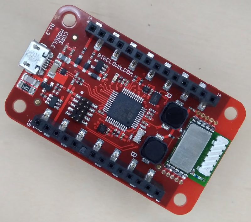 Základem každého vašeho zařízení bude tzv. Core modul. Tento modul se skládá z mikrokontroléru, vysílače/přijímače pro frekvenci 868MHz, hardwarového šifrovacího obvodu, čidla teploty, 3-osého akcelerometru, RGB LED diody, dvou tlačítek (reset a boot) a micro USB konektoru.