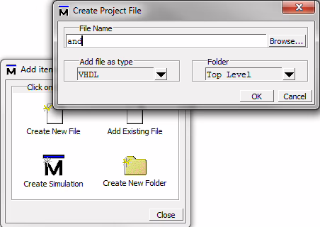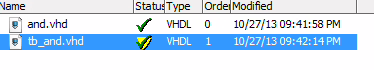 Založíme si rovnou 2 soubory a to „and.vhdl“ a „tb_and.vhd“. TB – test Bench, soubor, testující chování námi navrženého obvodu. Jak můžete vidět, v kolonce „Status“ jsou otazníky, to znamená soubory ještě nebyli zkompilovány.