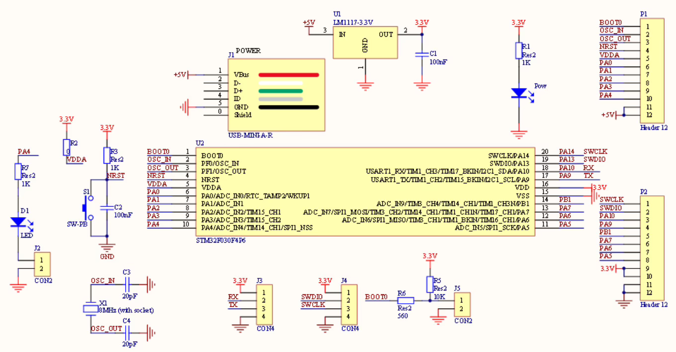 Deska, kromě samotného mikrokontroléru z rodiny STM32, obsahuje pouze 3.3V stabilizátor, micro USB, reset tlačítko, LED řízenou z mikrokontroléru a LED indikující připojené napájení.