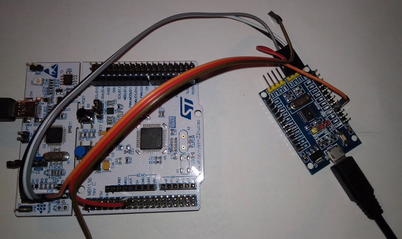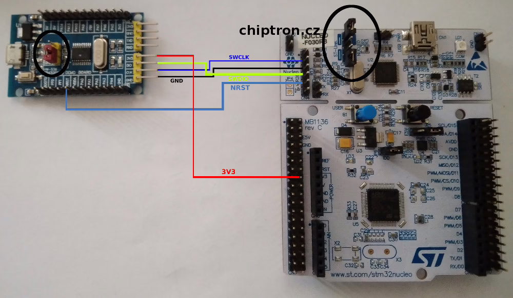 Jak jsem zmínil výše, jako programátor jsem použil originální vývojovou desku od STMicroelectronics, která obsahuje ST-LINK. Tento programátor a debugger v jednom je dostupný na všech vývojových deskách Nucleo.