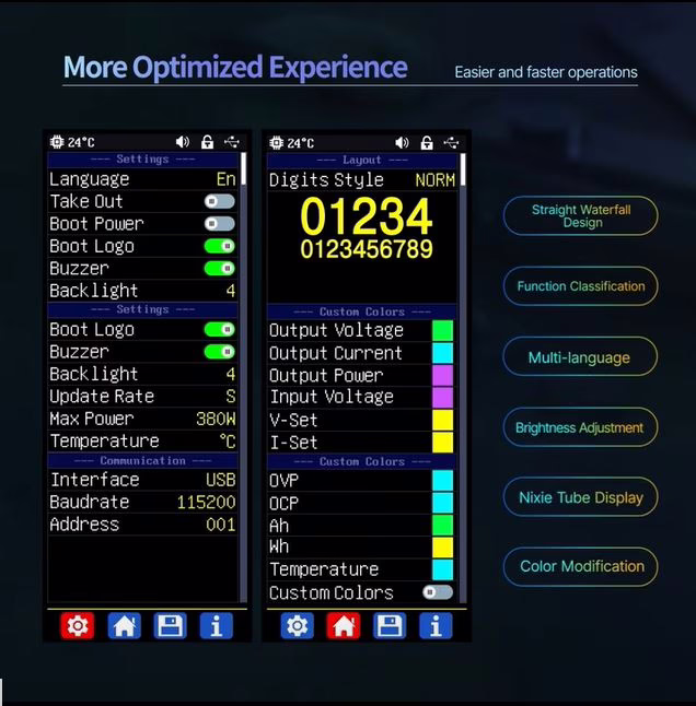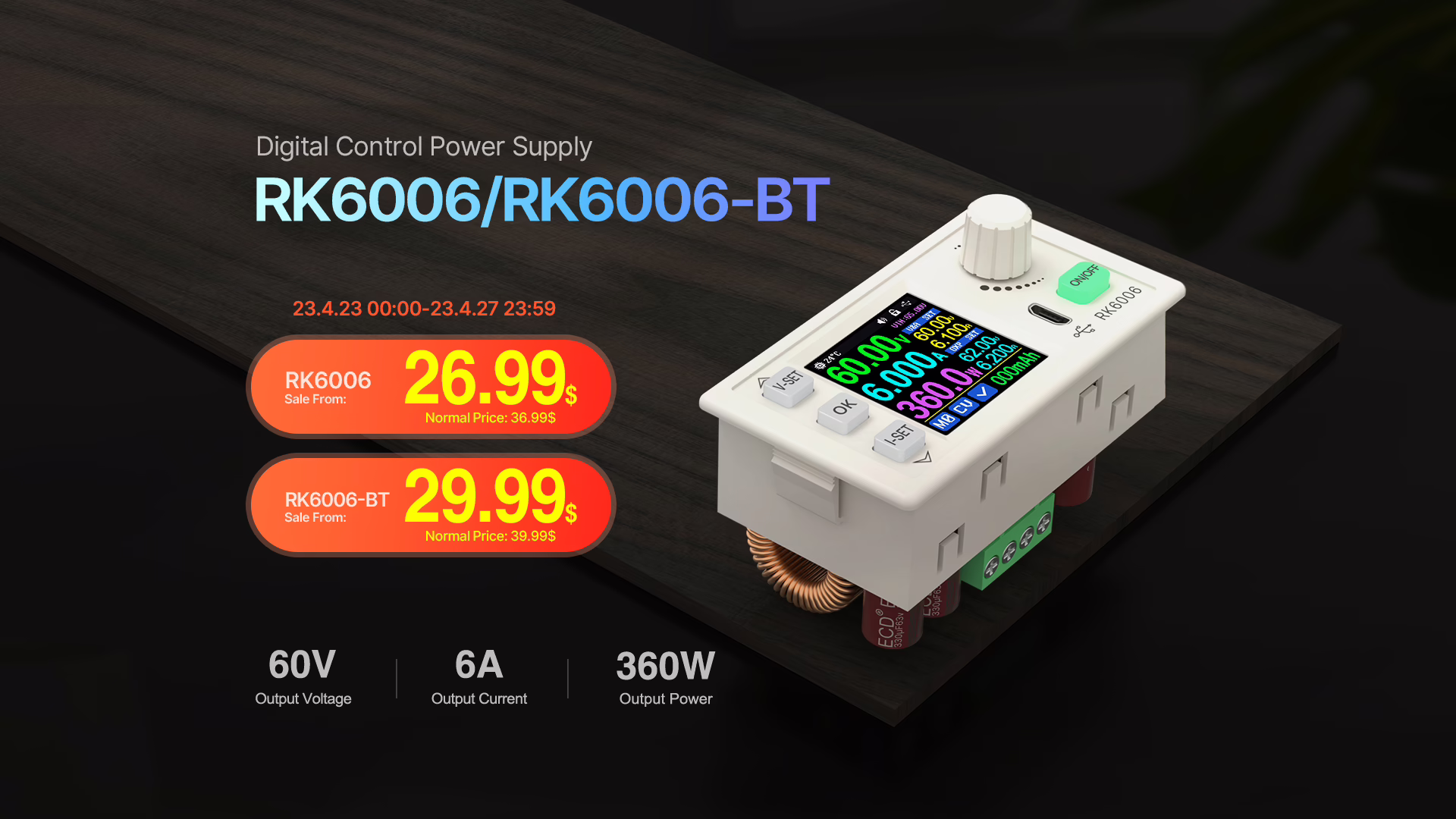 RK6006 oproti DPS5005 nabízí větší displej: 240x240px namísto 128x128px navíc i samotný displej je větší 1.54″ namísto 1.44″. Další velkým rozdílem je i maximální napětí, proud a výkon. Jak název produktu napovídá, RK6006 může mít až 60V výstup, až 6A a celkový výkon tak může dosáhnout 360W.